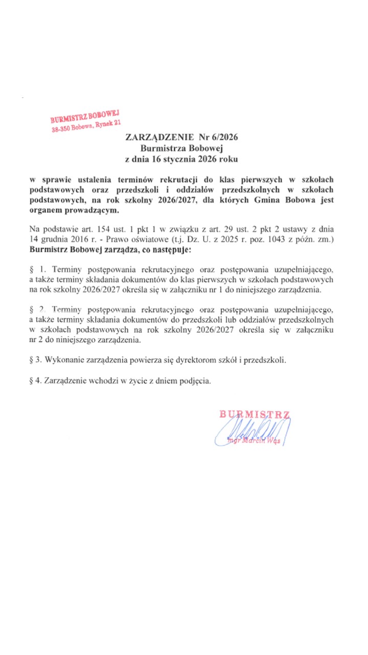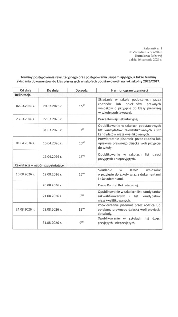 Rodzice kandydatów zakwalifikowanych do Przedszkola Samorządowego w Bobowej zobowiązani są do pisemnego potwierdzenia woli przyjęcia dziecka w terminie od 1 do 14 kwietnia 2026r. do godz. 15.00